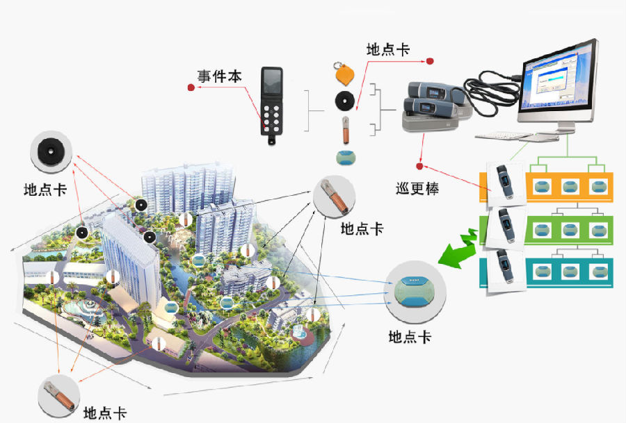 其基本的原理就是在巡查線路上安裝一系列代表不同點(diǎn)的射頻卡(又稱感應(yīng)卡,信息鈕,有固定的不同卡號),巡查到各點(diǎn)時巡查人員用手持式巡更棒讀卡,把代表該點(diǎn)的卡號和時間及情況同時記錄下來。巡查完成后巡更棒通過通訊線或無線傳輸把數(shù)據(jù)傳給計算機(jī)軟件處理,就可以對巡查情況(人員、地點(diǎn)、時間、情況等)進(jìn)行記錄和考核,實(shí)現(xiàn)人員的科學(xué)化管理。