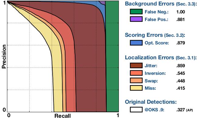 2)Miss:在所有遺漏錯(cuò)誤(miss error)都被糾正之后,OKS = 0.9處的PR(嚴(yán)格的OKS下的AP)。缺失(miss)是一個(gè)很大的定位誤差:檢測(cè)到的關(guān)鍵點(diǎn)不在正確的身體部位附近。