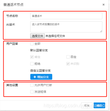 普通節(jié)點的節(jié)點名稱和話術(shù)不能為空,節(jié)點名稱可自定義,AI話術(shù)即為機(jī)器人撥打客戶電話時播放的錄音的文本內(nèi)容,選擇文件上傳事先準(zhǔn)備好的錄音。