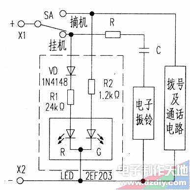 電路如附圖所示,只使用4個電子元件,便可指示電話機掛機等待、摘機通話或撥號、電話未掛好、電話線被盜用及來電指示等。電路簡單實用,耗電低,不會影響電話機和程控交換機正常工作。 LED為低電流高亮度紅(R)、綠(G)雙色發(fā)光二極管,R1和R2是調(diào)節(jié)發(fā)光亮度的限流電阻。VD為保護二極管。 1.掛機狀態(tài)在掛機時,電話機叉簧開關(guān)SA接通電子鈴電路,等待收鈴。這時。程控交換機通過電話線X1、X2送48V或60V(由交換機型號決定)直流饋電電壓,紅色發(fā)光管LED~R發(fā)光,作待機指示;如果在掛機狀態(tài)LED~R不亮,說明電話線斷線開路或者電話線被盜用,使得X1、X2兩端電壓大幅度下跌,應(yīng)及時檢修或處理。 2.收鈴狀態(tài)鈴流信號是約90V、25Hz的交流信號.當(dāng)呼叫本機時。鈴流信號經(jīng)限流電阻R和隔直電容C使電子鈴電路工作。發(fā)出振鈴聲;同時鈴流信號還經(jīng)VD整流.使LED~R發(fā)出閃爍的紅光。 3.摘機狀態(tài)當(dāng)向外撥打電話或接聽電話摘機時,叉簧開關(guān)SA斷開電子鈴電路,接通撥號及通話電路。由于此時電話機直流主回路被接通,所以X1、X2兩端的直流饋電電壓被下拉至5~8V,綠色發(fā)光管LED~G發(fā)光,指示電話機處于撥號及通話狀態(tài);如果掛機后LED~G仍發(fā)綠光.說明叉簧開關(guān)SA未被切換到掛機位置.這時應(yīng)重新掛機。以免影響下次收鈴。 作者:瞿貴榮