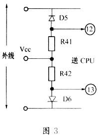 由圖2可知,電話外線從PORT4端口進入本機,在PORT4(1)腳經(jīng)過話機叉簧開關(guān)PORT6加到極性變換及保護電路D3正極,(2)腳加到保護電路D4正極。極性變換電路由四個二極管構(gòu)成橋式整流電路,它們進行極性變換及保護,以保證其它電路可靠穩(wěn)定地工作,并使進入本電話機的信號極性保持一致。