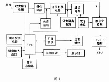 1 引 言 投幣電話機具有無需專人看管,可完成自動收幣,使用靈活的特點,為電信服務(wù)部門提高勞動生產(chǎn)率,以及方便廣大市民的通信聯(lián)系起到了積極的作用。2 設(shè)計功能介紹 投幣電話機與普通電話機的主要區(qū)別是增加了打電話時的即時記時收費功能。具體為,當打電話者在撥號前將規(guī)定種類的硬幣投入到電話機中,電話機判別其達到規(guī)定幣值后,方允許用戶撥號。如果撥號接通,則在被叫方摘機的瞬間,交換機就會向做重叫的投幣話機送來收費信號,當投幣話機接收到這一信號后接收投幣;如果未叫通被叫方,則用戶掛機,投幣話機即退出硬幣。記時是從被叫電話應答時開始,且當通話到所投幣規(guī)定用時前會發(fā)出語音告警信息,如果在告警期間再投入規(guī)定的硬幣,則可繼續(xù)打電話,否則投幣話機到時會強行自動拆線?! ⊥稁烹娫挋C電路方框圖見圖1。3 電路組成 該投幣電話機各個電路由CPU統(tǒng)一管理、協(xié)調(diào)?! ∷饕梢韵码娐方M成:收費信號檢測電路、極性保護電路、收幣驅(qū)動電路、開關(guān)切換電路、通話電路、語音隔離電路、發(fā)號電路、450Hz撥號音檢測電路、CPU組成的單片機控制電路、語音模塊及顯示器電路等,其中開關(guān)切換電路、收幣驅(qū)動電路、語音模塊及顯示器電路、撥號音檢測電路等均要受到控制電路CPU的監(jiān)控。在CPU的輸入端口,還接有硬幣檢測電路端口、按鍵輸入端口、及費率貯存器端口。 電路原理圖見圖2。