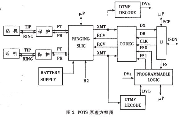 POTS接口采用LUCENT的L8576(SLIC)、L8503(CODEC)、保護保險絲、可編程邏輯器件GAL16V8D及MOTOROLA的MC145436(DTMF)。原理方塊圖如圖2所示。