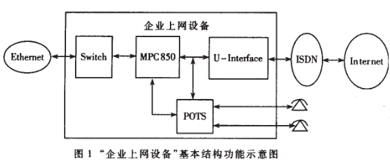 隨著網絡的發(fā)展,網絡帶這的增加,上網速度將越來越快。人們也不再僅限于上網,在追求上網的同時打網絡電話,實現(xiàn)與網友的相互交流。目前人們很大程度上依賴于傳統(tǒng)的ISDN上網,且在今后一段時間內,這種依賴不會發(fā)生很大變化。其于這種狀況,設計了針對企業(yè)的上網設備(簡稱“企業(yè)上網設備”),它實現(xiàn)了企業(yè)上網的同時又可打網絡電話雙重功能。企業(yè)上網設備的整體實現(xiàn)方案如圖1所示。