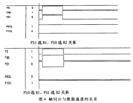 F0SEL、F1SEL是同步信號選擇信號,為0選通有效,為1則選通無效。F01CTL是幀同步控制信號,該信號在GAL16V8D內將被一分為二為互為反相的兩幀同步信號控制信號,它們與FS(IDL_FSR/C)幀同步信號異或產生選擇B1、B2數(shù)據(jù)通道的同步信號FS0、FS1。假設F01CTL被分F0SEL、F1SEL兩信號且它們有效,則它們的波形關系如圖4所示。