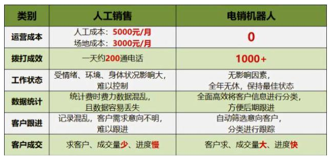 這時候,AI機器人電話的出現(xiàn)給他們提供了一種新的途徑,尤其是那些重度依賴電話營銷的行業(yè),諸如地產(chǎn)、借貸、廣告推銷等等。相比于傳統(tǒng)的人類業(yè)務(wù)員,AI機器人電話操作簡單、管理方便、效率更高、成本更低,種種優(yōu)點更好解決了以上企業(yè)的發(fā)展難題。