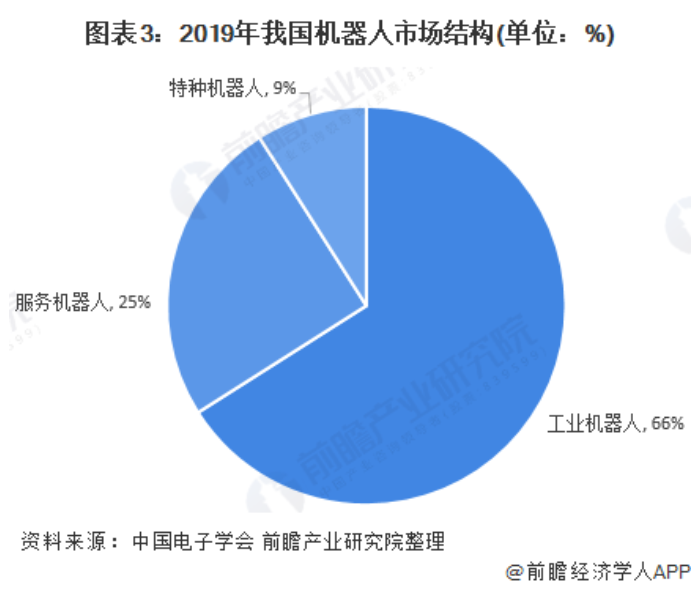 我國機(jī)器人根據(jù)不同用途可大致分為工業(yè)機(jī)器人、服務(wù)機(jī)器人以及特種機(jī)器人三類,其中工業(yè)機(jī)器人為當(dāng)前我國普及度最高的機(jī)器人種類,占據(jù)最多市場份額。根據(jù)中國電子學(xué)會數(shù)據(jù),從我國2019年機(jī)器人市場結(jié)構(gòu)來看,工業(yè)機(jī)器人占比最高,達(dá)到66%;其次為服務(wù)機(jī)器人,占比25%;特種機(jī)器人應(yīng)用程度相對較低,占比僅為9%,不足10%。