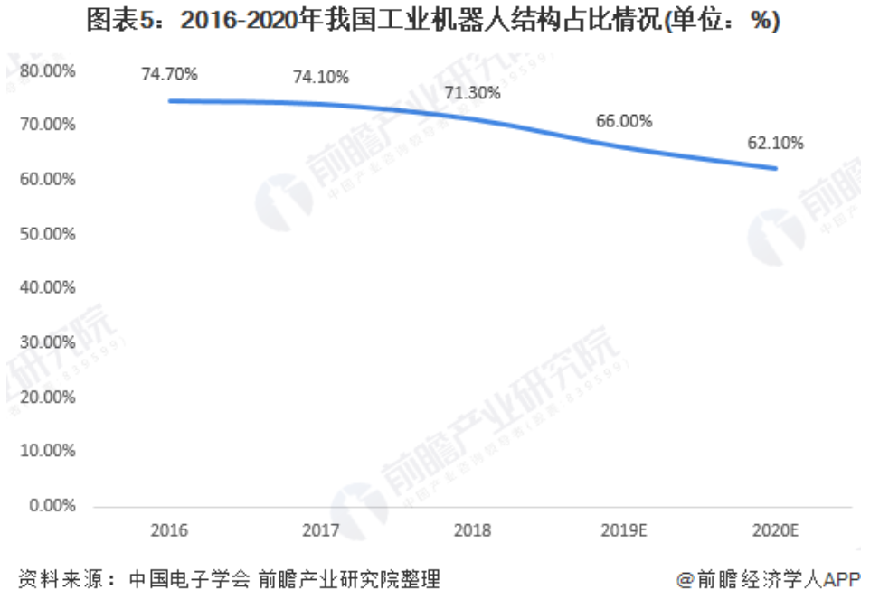 但增速方面,現(xiàn)階段我國工業(yè)機(jī)器人市場規(guī)模擴(kuò)張速度明顯放緩,2018年我國工業(yè)機(jī)器人銷售額增速為5.9%,較2017年同比下降24.3個(gè)百分點(diǎn),估計(jì)2019年延續(xù)2018年緩慢增長趨勢。受此影響,工業(yè)機(jī)器人在全國機(jī)器人市場總規(guī)模中的占比也逐漸下滑,2018年我國工業(yè)機(jī)器人市場規(guī)模在機(jī)器人市場總規(guī)模中占比超過70%,預(yù)計(jì)2020年將減少至62%左右。