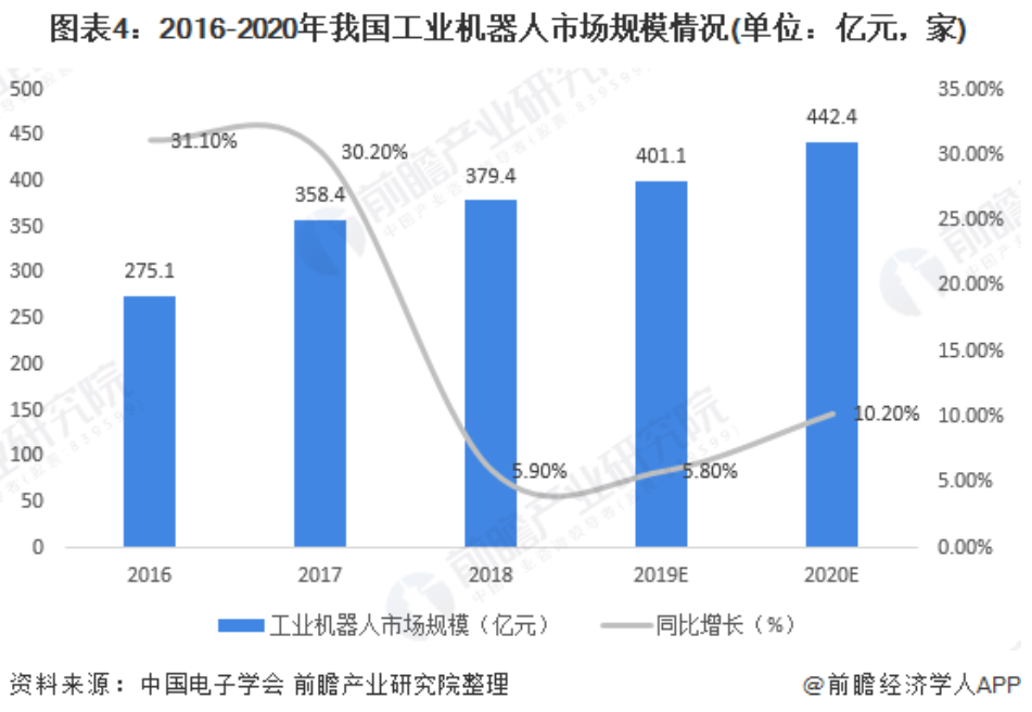 工業(yè)機(jī)器人市場規(guī)模位居全球前列,但擴(kuò)張態(tài)勢明顯趨緩 作為我國三種不同類型機(jī)器人中占據(jù)最多市場份額的工業(yè)機(jī)器人,由于下游消費(fèi)端行業(yè)眾多,在我國產(chǎn)業(yè)全面智能化發(fā)展的當(dāng)下,其市場需求亦不斷擴(kuò)張,目前我國工業(yè)機(jī)器人市場規(guī)模已位居全球前列。2019年估計(jì)我國工業(yè)機(jī)器人銷售額已突破400億元,較2016年有較大漲幅。