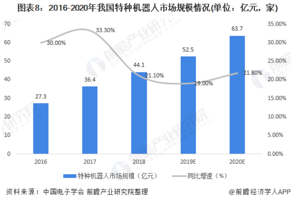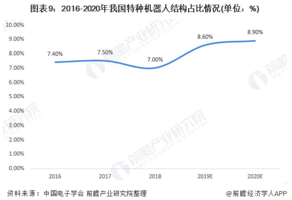 特種機(jī)器人市場規(guī)模穩(wěn)步增長,結(jié)構(gòu)占比小幅提升 與工業(yè)機(jī)器人和服務(wù)機(jī)器人類似,2016-2019年在全國智能化產(chǎn)品推廣不斷深入的情況下我國特種機(jī)器人市場規(guī)模也呈現(xiàn)穩(wěn)步增長態(tài)勢。2019年我國特種機(jī)器人市場規(guī)模估計(jì)為52.5億元,較2016年增長25.2億元。 增速方面,我國特種機(jī)器人市場的表現(xiàn)介于工業(yè)機(jī)器人與服務(wù)機(jī)器人之間,2018年后雖有下滑但降幅相對工業(yè)機(jī)器人市場而言較小,總體表現(xiàn)與我國整體機(jī)器人市場擴(kuò)張速度展現(xiàn)較高一致性。