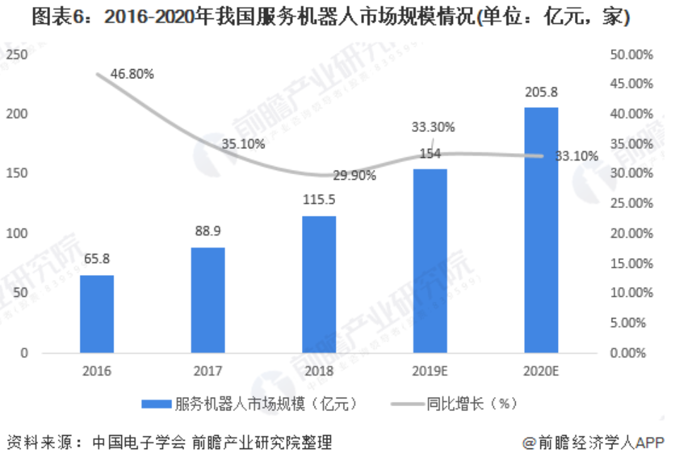 服務(wù)機(jī)器人市場規(guī)模增長迅速,市場份額逐年遞增 隨著我國服務(wù)機(jī)器人下游應(yīng)用范圍的不斷拓寬,其市場規(guī)模擴(kuò)張較為迅速。2016-2018年我國服務(wù)機(jī)器人市場規(guī)模增速均維持在30%以上,即使在2018年后全國機(jī)器人市場發(fā)展增速減緩大環(huán)境下,服務(wù)機(jī)器人下游需求亦未出現(xiàn)較大波動(dòng)。2019年估計(jì)我國服務(wù)機(jī)器人市場規(guī)模已達(dá)到154億元,較2016年大幅增長88.2億元,年復(fù)合增長率為32.77%。