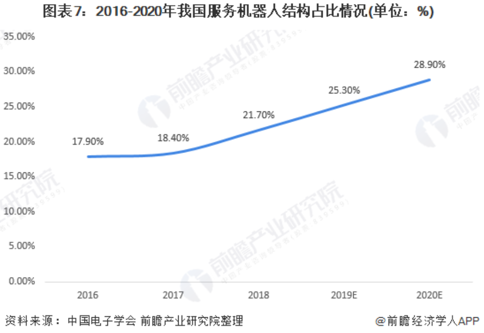 得益于我國服務(wù)機(jī)器人良好發(fā)展態(tài)勢,2016-2019年我國服務(wù)機(jī)器人市場規(guī)模在全國機(jī)器人市場總規(guī)模中的占比呈現(xiàn)上升態(tài)勢。2016年我國服務(wù)機(jī)器人在全國機(jī)器人市場中所占份額不足20%,但2019年其結(jié)構(gòu)占比已突破25%。