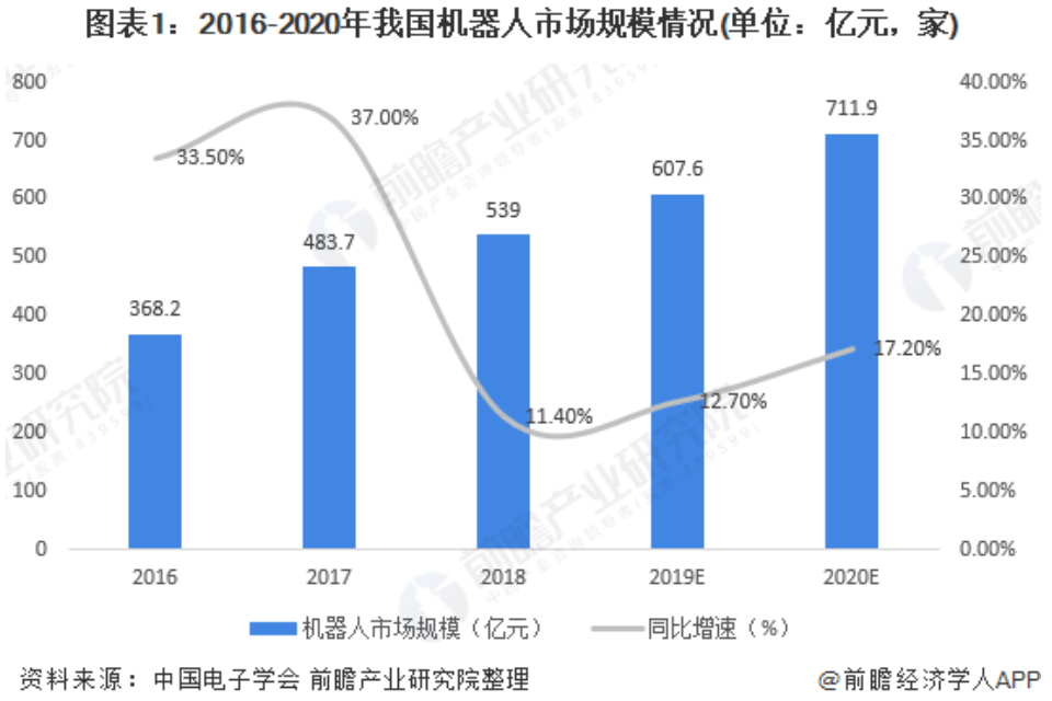 機(jī)器人市場規(guī)模持續(xù)擴(kuò)張,工業(yè)機(jī)器人占據(jù)最多市場份額 現(xiàn)階段,受我國科技發(fā)展以及智能化相關(guān)產(chǎn)品普及程度極大提高的影響,機(jī)器人市場迎來發(fā)展小高峰。根據(jù)中國電子學(xué)會數(shù)據(jù),2016年我國機(jī)器人市場規(guī)模僅368.2億元;隨后2017年迅速增長至483.7億元,同比增速達(dá)到37%,接近40%。雖然2018年我國機(jī)器人市場規(guī)模增速放緩但仍維持在10%以上,共計(jì)實(shí)現(xiàn)銷售額539億元。預(yù)計(jì)2020年我國機(jī)器人市場有望突破700億元。