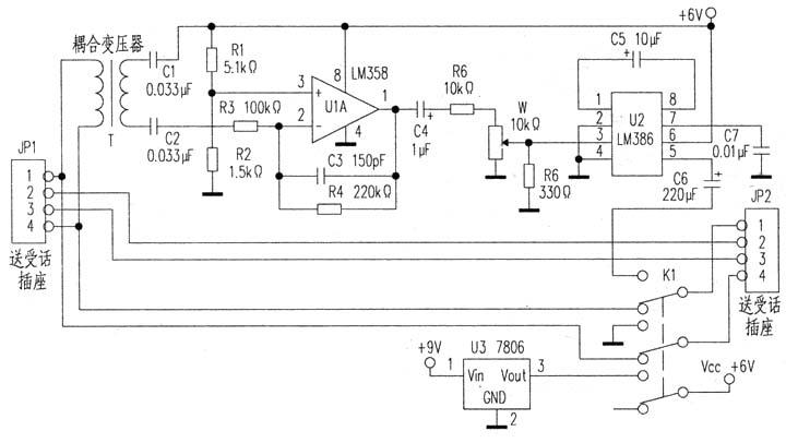 電話(huà)音量放大電路 本電路為耳聾人設(shè)計(jì),JP1插至電話(huà)機(jī)手柄插座,原電話(huà)機(jī)手柄則插在JP2插座,開(kāi)關(guān)K1為正常/耳聾人使用轉(zhuǎn)換開(kāi)關(guān),圖中位置為正常人使用狀態(tài),受話(huà)信號(hào)由JP1直接送至JP2到耳機(jī),不經(jīng)放大器,電器也被切斷;當(dāng)耳聾人使用時(shí),撥動(dòng)K1,6V電源加至放大器,電話(huà)機(jī)受話(huà)信號(hào)經(jīng)變壓器T耦合至LM358進(jìn)行預(yù)放大,輸出信號(hào)經(jīng)電位器調(diào)整到適當(dāng)音量后送至U2放大,輸出后經(jīng)JP2送到耳機(jī),耳聾人使用時(shí)調(diào)整W到適當(dāng)音量即可制作時(shí),變壓器T可用電話(huà)機(jī)中振鈴電路的輸出耦合變壓器或收音機(jī)中的輸出耦合變壓器,本電路中需初、次級(jí)反向使用。插座JP1、JP2中,送受話(huà)器接線(xiàn)應(yīng)與所選電話(huà)機(jī)的接線(xiàn)一致。