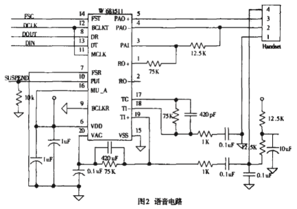 音頻電路:如圖2所示,W681511與Tiger560B的串行端口直接相連。串行端口包含一數(shù)據(jù)時(shí)鐘(DCLK)。一幀同步時(shí)鐘(FSC)和兩條數(shù)據(jù)線(DIN和DOUT)。FSC是8KHZ時(shí)鐘,在一個(gè)FSC周期內(nèi),傳輸和接收8位u-law率音頻數(shù)據(jù)。