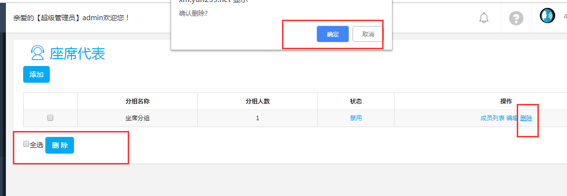 如下圖:點(diǎn)擊列表行右邊的“刪除”關(guān)鍵字,或者 點(diǎn)擊列表行右邊的復(fù)選框,或點(diǎn)擊表格左下邊的全選復(fù)選框后點(diǎn)擊“刪除”按鈕,彈出確認(rèn)刪除框,點(diǎn)擊確認(rèn)即可刪除,如果不刪除,點(diǎn)擊取消即可。