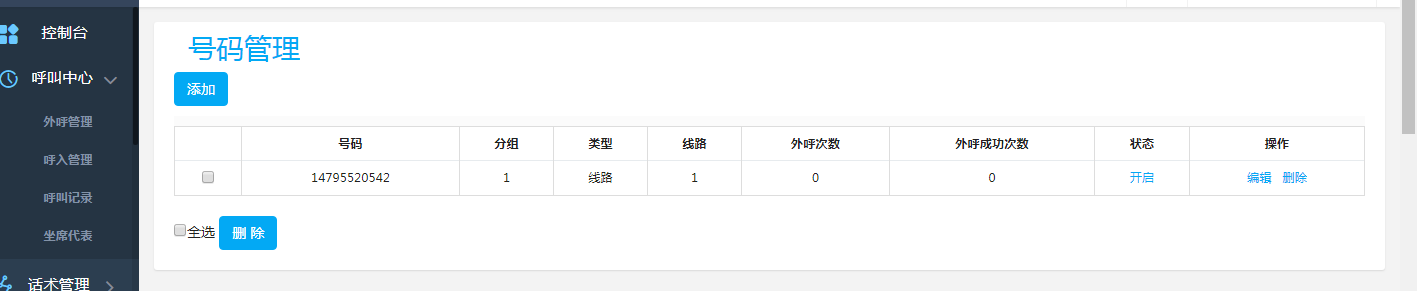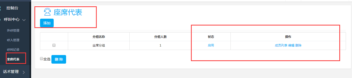 右側(cè)菜單-座席代表,點(diǎn)擊進(jìn)入座席代表管理界面,左上是“添加”座席按鈕,列表的右邊是對該座席的各種操作,點(diǎn)擊狀態(tài)列的“啟用”或“禁用”關(guān)鍵字可以修改狀態(tài),列表的下面是批量刪除按鈕,可以選擇后批量刪除。