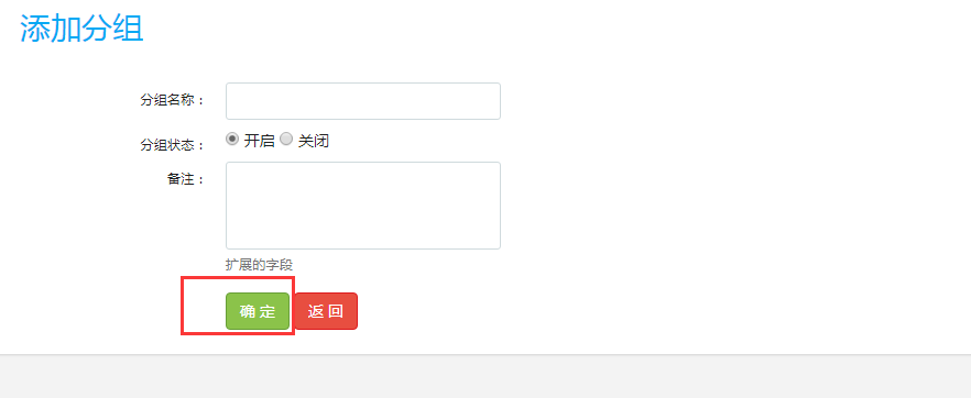 如下圖:點擊“添加分組”按鈕,來到添加分組頁面,填寫分組名稱和備注,點擊“確定即可”