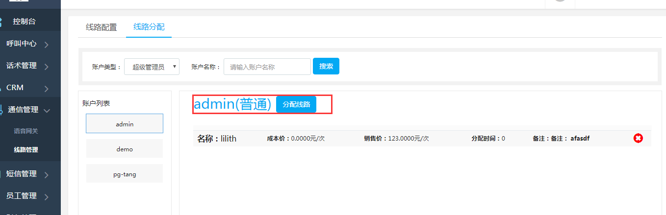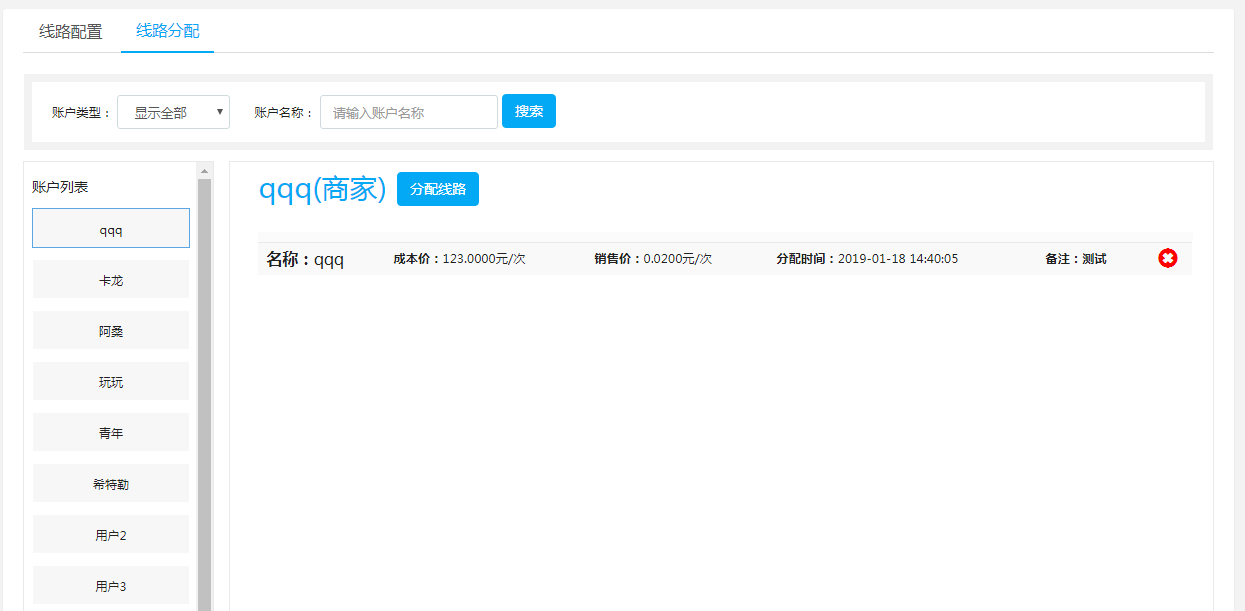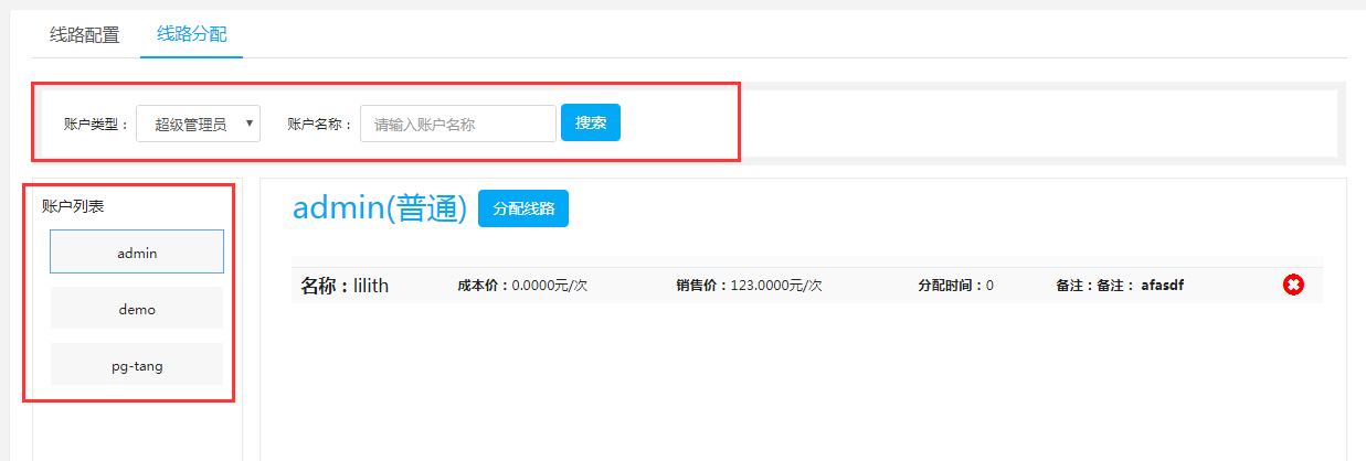 如下圖:上面是搜索條件,左邊是賬戶,右邊是該賬戶下面分配的線路。