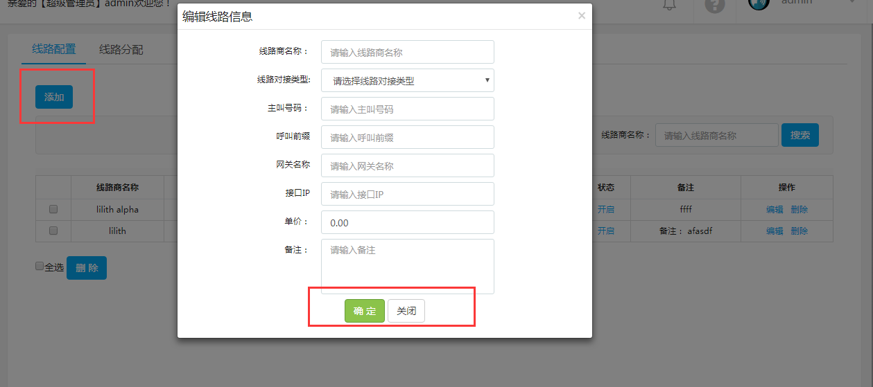 1)單擊“添加”按鈕,彈出編輯線路信息對(duì)話框,填寫必要信息后,點(diǎn)擊“保存”按鈕即可。