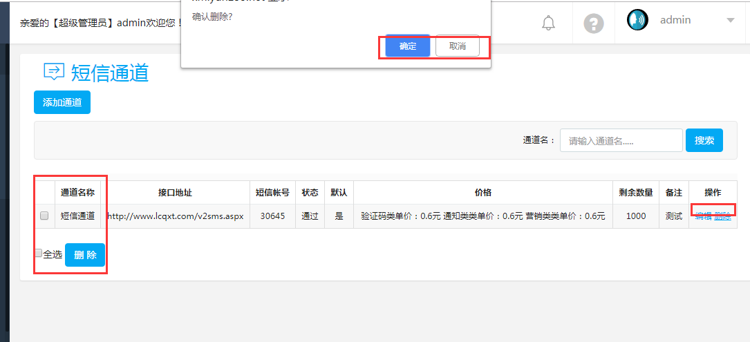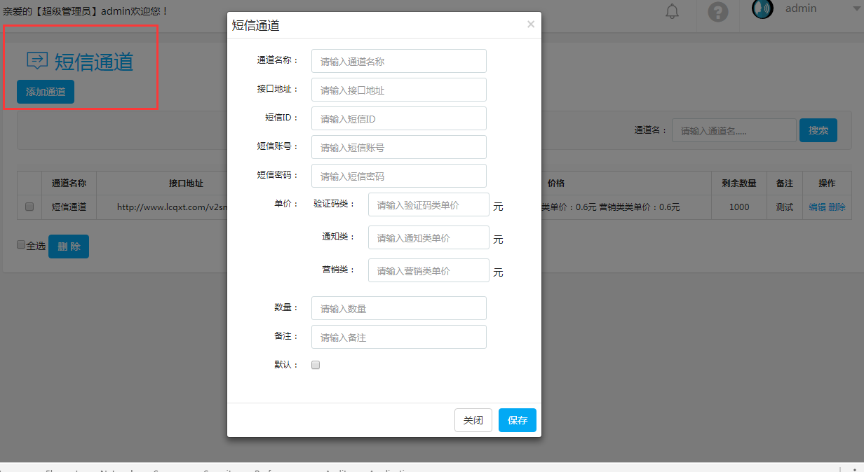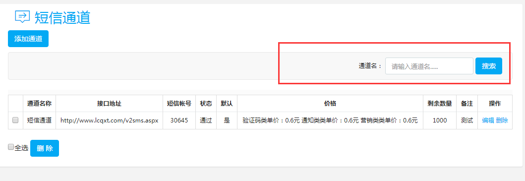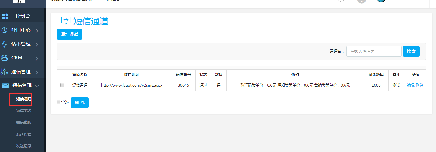 右側菜單-短信管理-短信通道,點擊進入短信通道管理界面