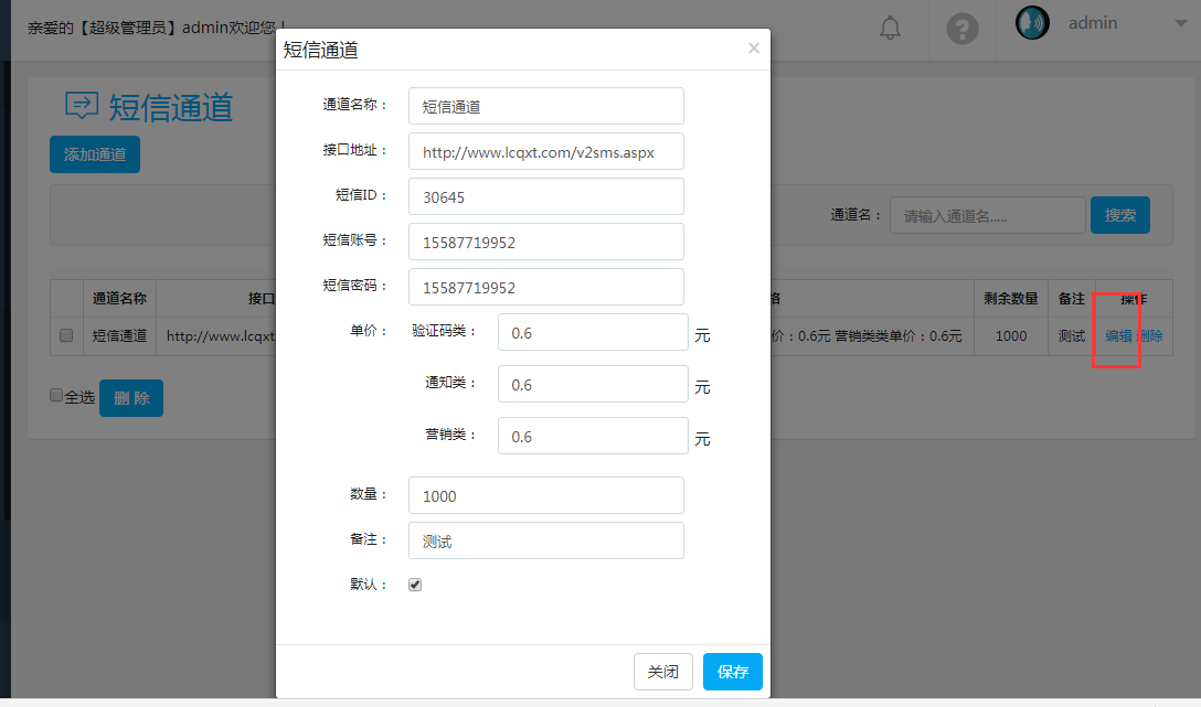 1)單擊“添加通道”按鈕,彈出編輯短信通道對話框,填寫必要信息后,點擊“保存”按鈕即可。