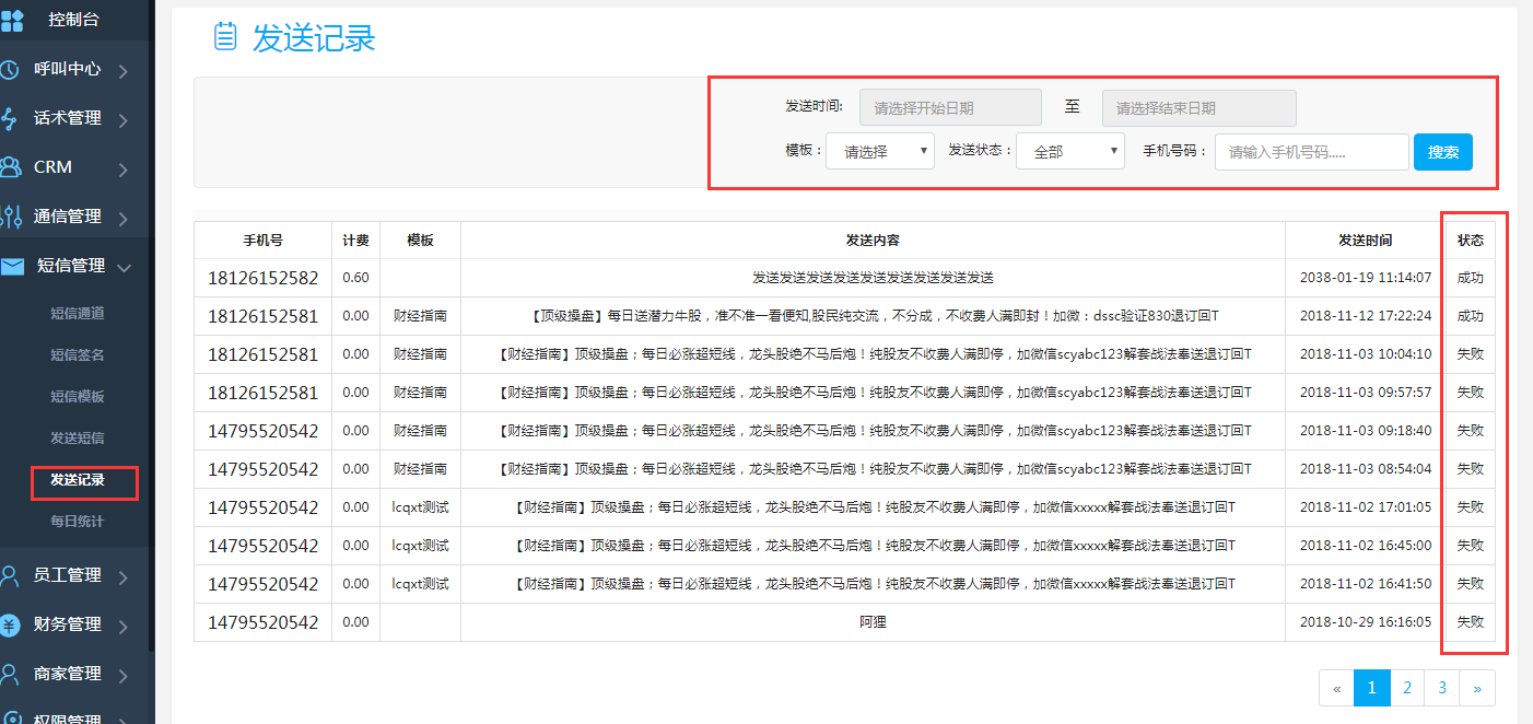 右側(cè)菜單-短信管理-發(fā)送記錄,點(diǎn)擊進(jìn)入發(fā)送記錄管理界面
