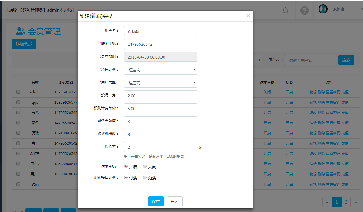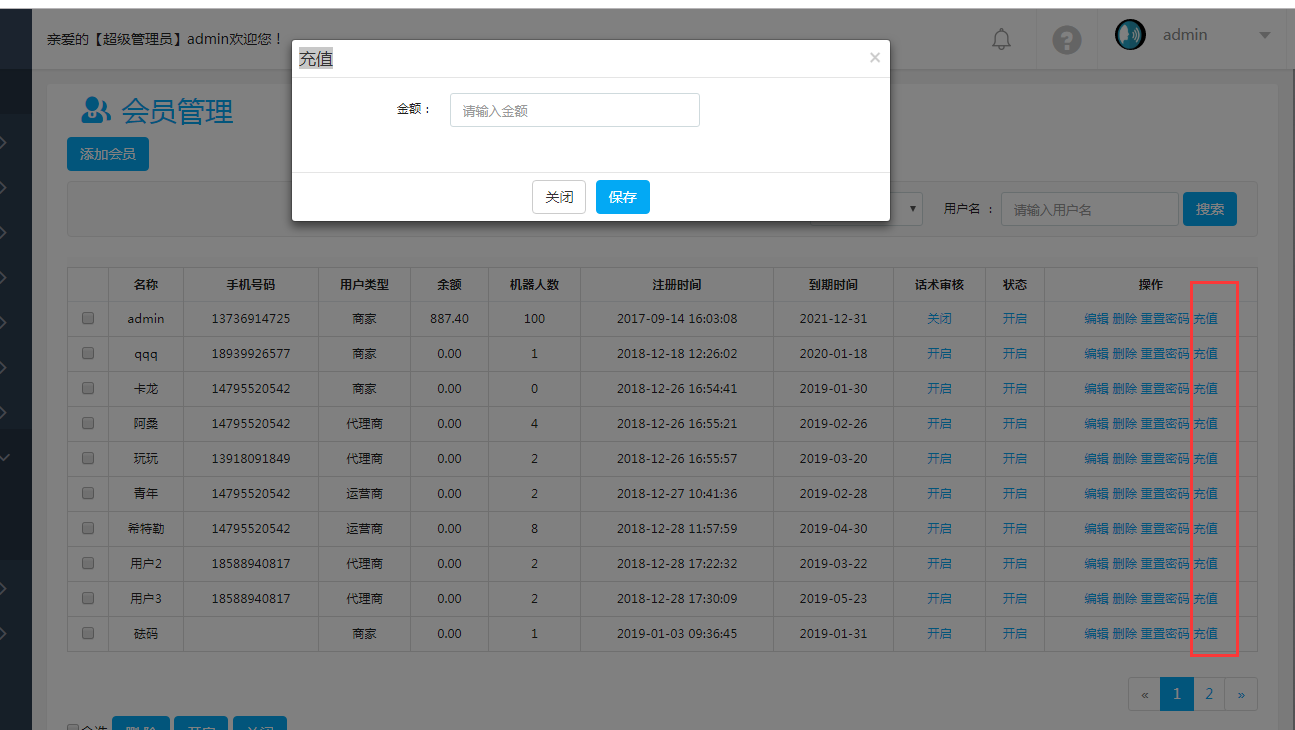 如下圖,點擊“操作”列的充值關鍵字,彈出充值對話框,輸入金額點擊保存就可以給賬戶充錢。