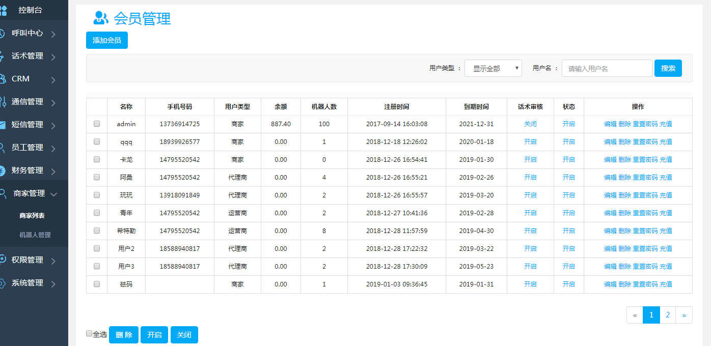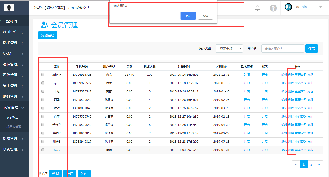 如下圖,點擊狀態(tài)列的 “開啟” “關閉” 關鍵字,即可修改該賬戶的狀態(tài)。關閉狀態(tài)的賬戶是被凍結的。