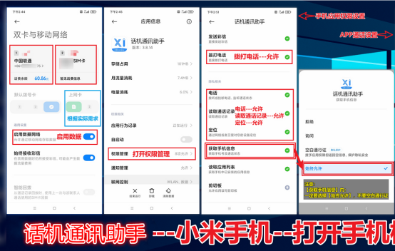 ②:(小米手機(jī):設(shè)置---應(yīng)用程序---應(yīng)用管理:話機(jī)通信助手---權(quán)限-撥打電話-獲取手機(jī)信息(空白通行證改為允許)-錄音---全部改為【始終允許】)