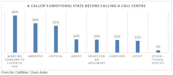 現(xiàn)實情況是,每個呼叫中心座席都必須面對以消極心態(tài)進行聯(lián)絡(luò)的客戶并解決他們的問題。CallMiner客戶流失指數(shù)顯示,超過三分之一的客戶(36%)表示他們是帶著煩惱來的;六分之一(16%)是生著氣來的,同樣的比例是腦子混亂準備爭吵來的!