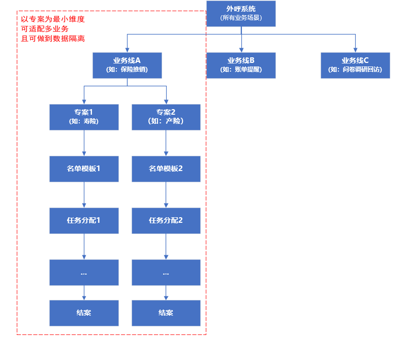 專案管理指:管理某一特定類型的外呼任務(wù),比如:保險(xiǎn)行業(yè)中監(jiān)管要求的某一險(xiǎn)種的外呼回訪和房地產(chǎn)行業(yè)中某一樓盤推銷的外呼,業(yè)務(wù)不一樣,外呼的內(nèi)容和相關(guān)的規(guī)則不一樣,就需要單獨(dú)的管理。