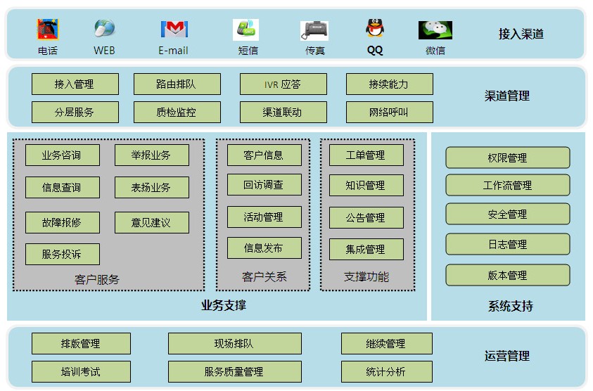 系統(tǒng)支撐負(fù)責(zé)提供多媒體呼叫中心正常運(yùn)行所需的基本管理功能,包括:操作權(quán)限管理、工作流管理、安全管理、操作日志管理、軟件版本控制及系統(tǒng)接口管理。