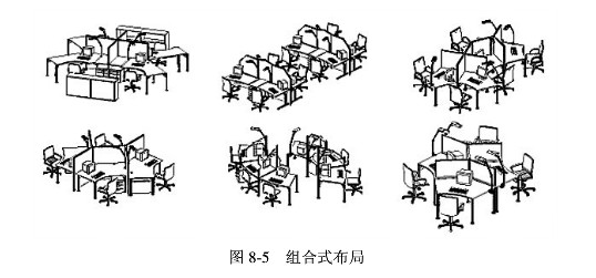組合式(如圖8-5所示)呼叫中心現(xiàn)場(chǎng)布局則可有效地結(jié)合以上幾種常見(jiàn)布局方式的優(yōu)點(diǎn),加以變化,盡量減少各布局方式的局限性和缺點(diǎn)。當(dāng)然,這種方式的布局需要專業(yè)的環(huán)境設(shè)計(jì)機(jī)構(gòu)給予專門的現(xiàn)場(chǎng)定制,并對(duì)現(xiàn)場(chǎng)采光、噪音等進(jìn)行專業(yè)的數(shù)據(jù)測(cè)算和分析。