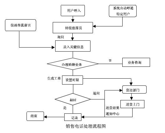 銷售電話適用于電視購物、倉儲式會員超市等。是一種新興的銷售形式如圖所示。它的特點是目標指向明確,需要涉及企業(yè)的倉儲、貨運、支付等系統(tǒng)。是一個典型的電子商務流程,而在這樣一個流程中,呼叫中心無疑是信息流的入口和終端。