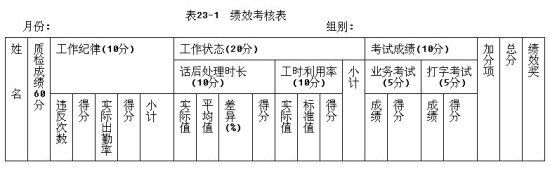 績效報表是依據(jù)各呼叫中心的績效考核方案制定的,是一種包含了人員各方面表現(xiàn)的綜合性報表,如表23-1所示。