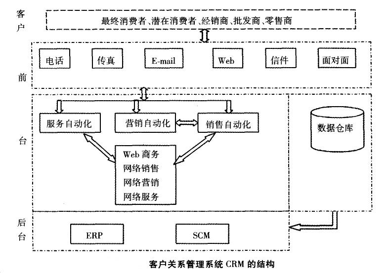 一套完整的CRM系統(tǒng)應(yīng)能實(shí)現(xiàn)營(yíng)銷、銷售、服務(wù)等業(yè)務(wù)的自動(dòng)化,實(shí)現(xiàn)客戶數(shù)據(jù)共享,達(dá)到提高客戶滿意度、降低成本、增加收人、開拓市場(chǎng)、幫助企業(yè)高層進(jìn)行生產(chǎn)、營(yíng)銷等決策的目的。因此,CRM系統(tǒng)的主要組成部分應(yīng)包括:客戶互動(dòng)渠道管理、營(yíng)銷自動(dòng)化管理、銷售自動(dòng)化管理、服務(wù)自動(dòng)化管理、Web商務(wù)、商務(wù)智能。如圖所示。