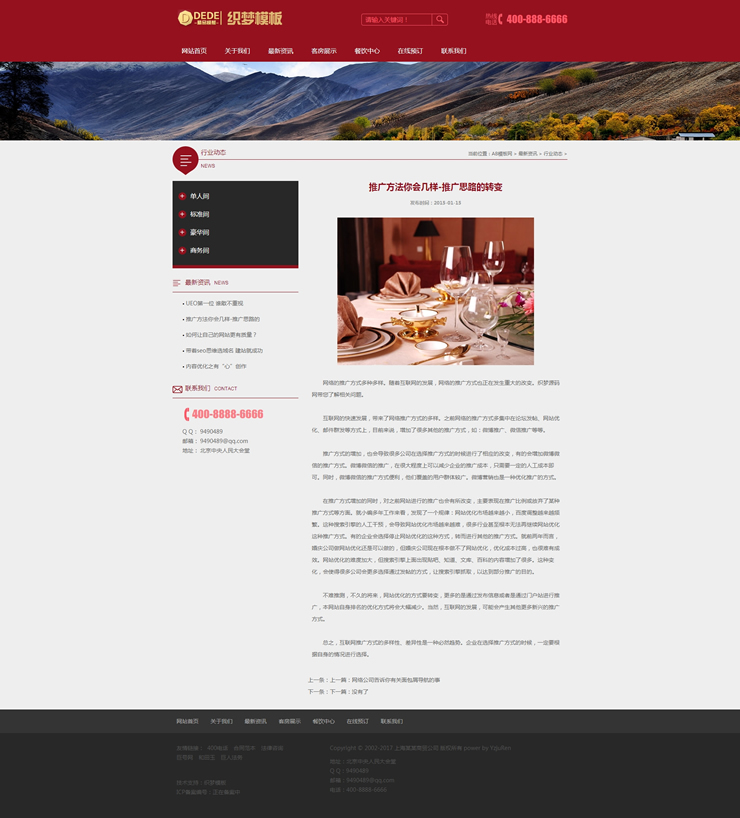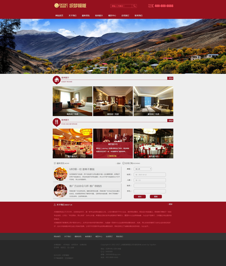 主頁 > 網(wǎng)站建設(shè) > 網(wǎng)站模板 > 酒類、食品、服飾、服務(wù) > 一款紅色酒店旅館網(wǎng)站源碼織夢餐飲酒店通用網(wǎng)