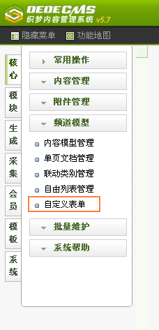 自定義表單位于主菜單“核心”選項卡下的[頻道模型]——[自定義表單],如圖: