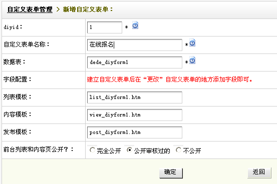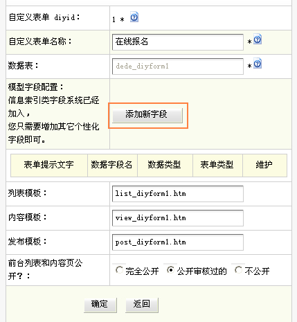 'dede_diyform1' 是你要調(diào)用的表的名稱 [field:lianjie/] 是你添加的表的字段名稱, 要想無需審核,提交之后立刻顯示,在增加新表單的“前臺列表和內(nèi)容頁公開?:”選項選擇“完全公開”。
