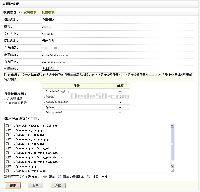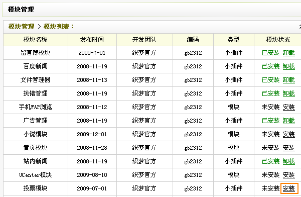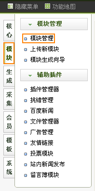 1、默認(rèn)情況下,投票插件是安裝好的。如果沒有安裝或者已卸載須再次安裝,請手動安裝,登錄后臺,單擊左側(cè)主菜單“模塊”,進(jìn)入其子菜單,如圖1,單擊“模塊管理”選項(xiàng),打開模塊列表頁面,單擊插件“投票模塊”后對應(yīng)的“安裝”,如圖3和圖4演示,然后完成安裝過程。
