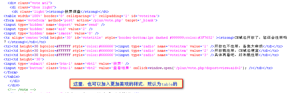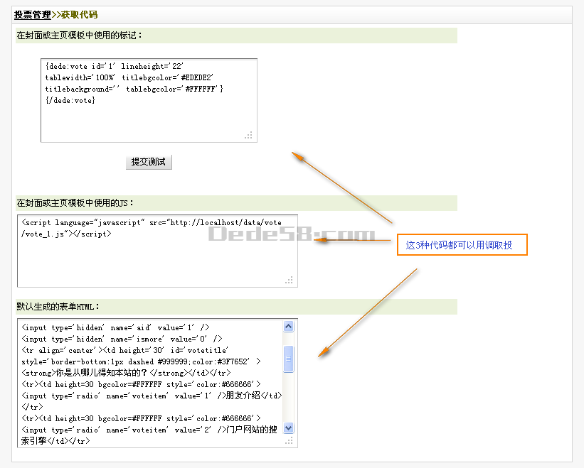 打開主頁模板templets/default/index.htm,在需要調(diào)用投票的地方加入投票代碼,投票調(diào)用有以下3種方式,如下圖: