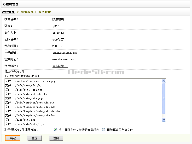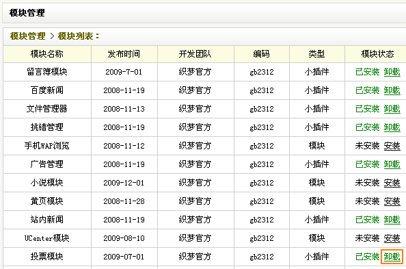 卸載投票插件步驟,首先登錄后臺,單擊左側(cè)主菜單“模塊”,進(jìn)入其子菜單,如圖1。單擊“模塊管理”選項(xiàng),打開模塊列表頁面,單擊插件“投票模塊”后對應(yīng)的“卸載”,然后完成卸載過程,如圖4和圖5。