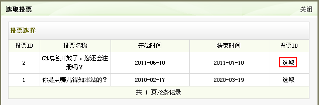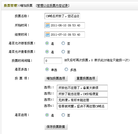 在我們添加一個新投票的過程中,如上圖所示,除了自定義投票標(biāo)題之外,我們可以設(shè)置投票開始和結(jié)束的時間,可以設(shè)置是否允許游客投票和查看投票結(jié)果,可以設(shè)置同一個ip是否可以重復(fù)投票。圖中,我們設(shè)置投票時間間隔為0,表示不允許同一ip重復(fù)投票。如果這里設(shè)置7,表示同一ip地址7天后可再次投票。另外,還可以設(shè)置是否允許用戶單選或者多選。最后,我們需要設(shè)置當(dāng)前投票是否啟用此投票,只有啟用的投票才能被使用。