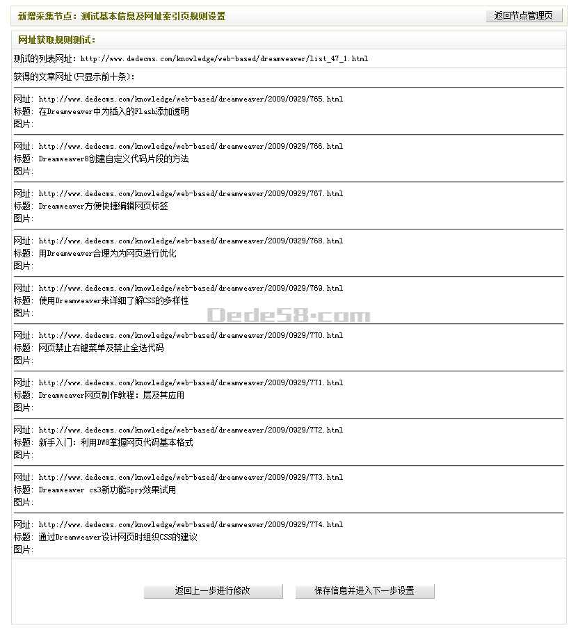 全部完成并檢查無誤后,單擊“保存信息并進入下一步設置“。如果之前設置正確,單擊后,將會進入“新增采集節(jié)點:測試基本信息及網(wǎng)址索引頁規(guī)則設置的網(wǎng)址獲取規(guī)則測試”頁面并看到相應的文章列表地址。如(圖21)所示,