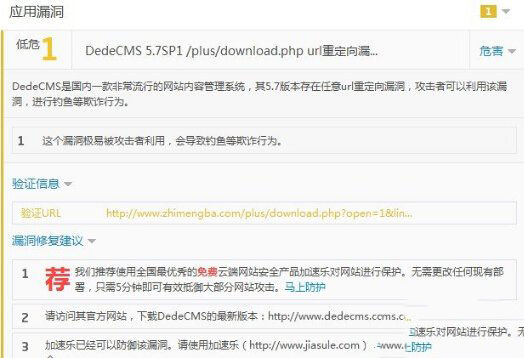 使用scanv網(wǎng)站體檢發(fā)現(xiàn)有DedeCMS 5.7SP1 /plus/download.php url重定向漏洞(如下圖),對比官方網(wǎng)站最新下載包發(fā)現(xiàn)該漏洞未進(jìn)行補丁,但官方自身網(wǎng)站已經(jīng)補上了,而官方演示站點均未補上。