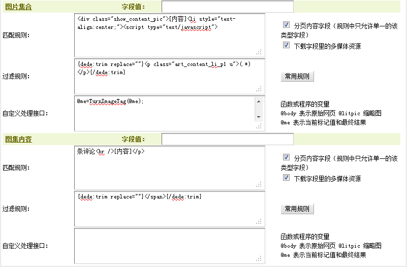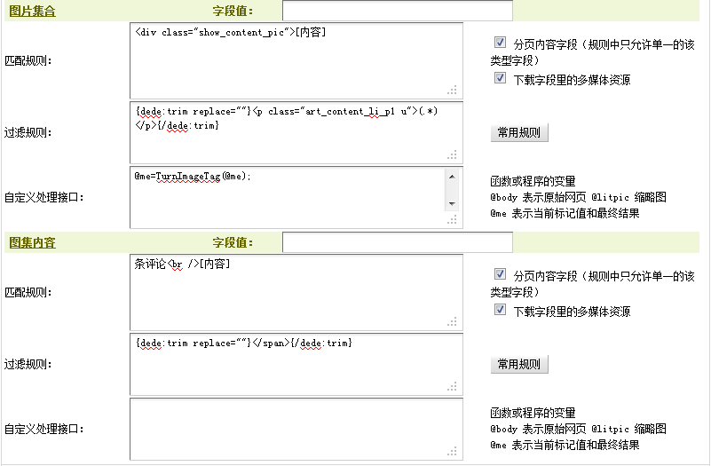 (1)“一些壁紙”是這個圖集的內(nèi)容,因此可以把“條評論<br/>”作為匹配圖集內(nèi)容的開始部分。但是這樣采集到的內(nèi)容會包含有</span>,應(yīng)該在過濾規(guī)則中使用“{dede:trim replace=""}</span>{/dede:trim}”過濾掉。