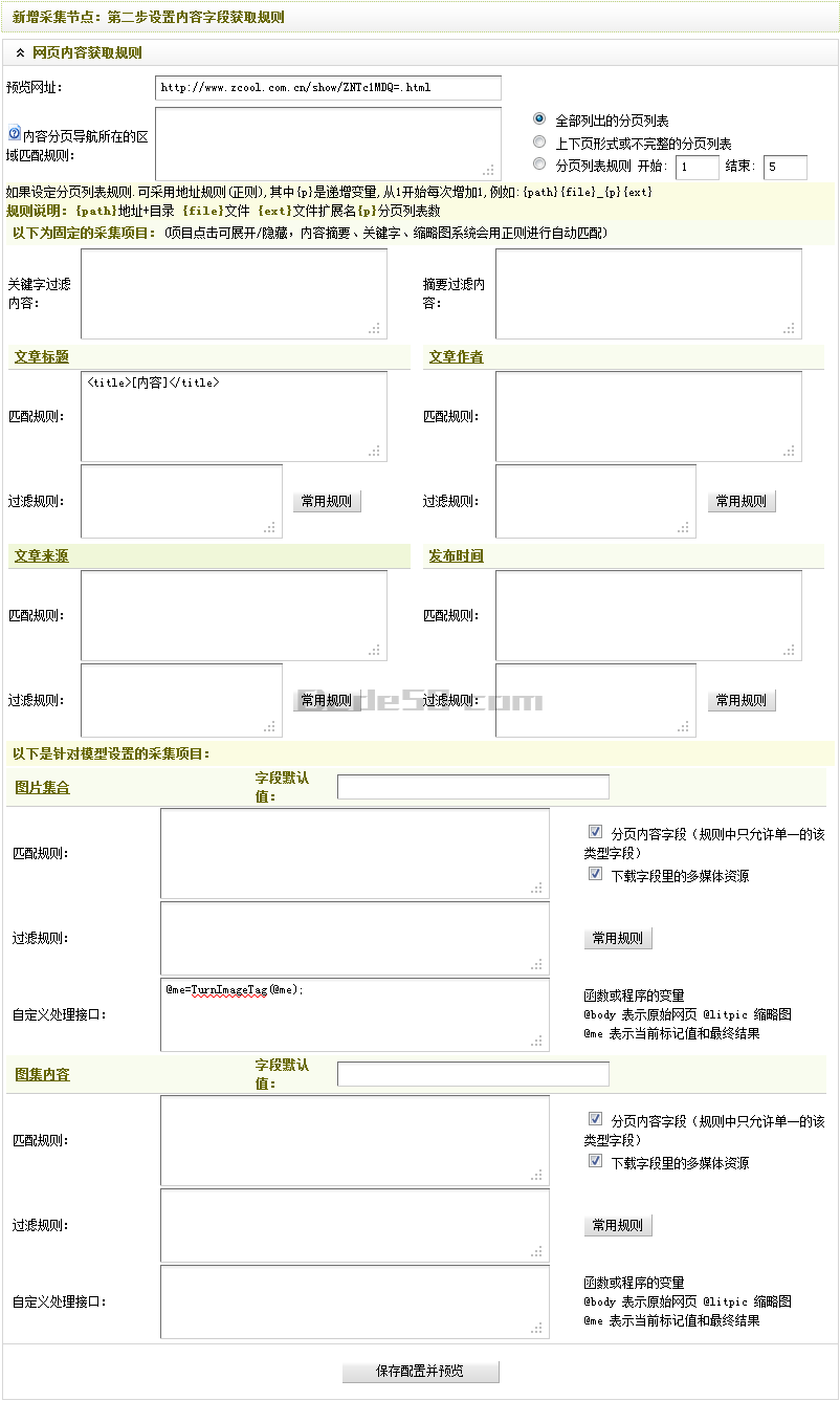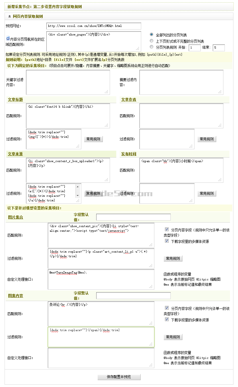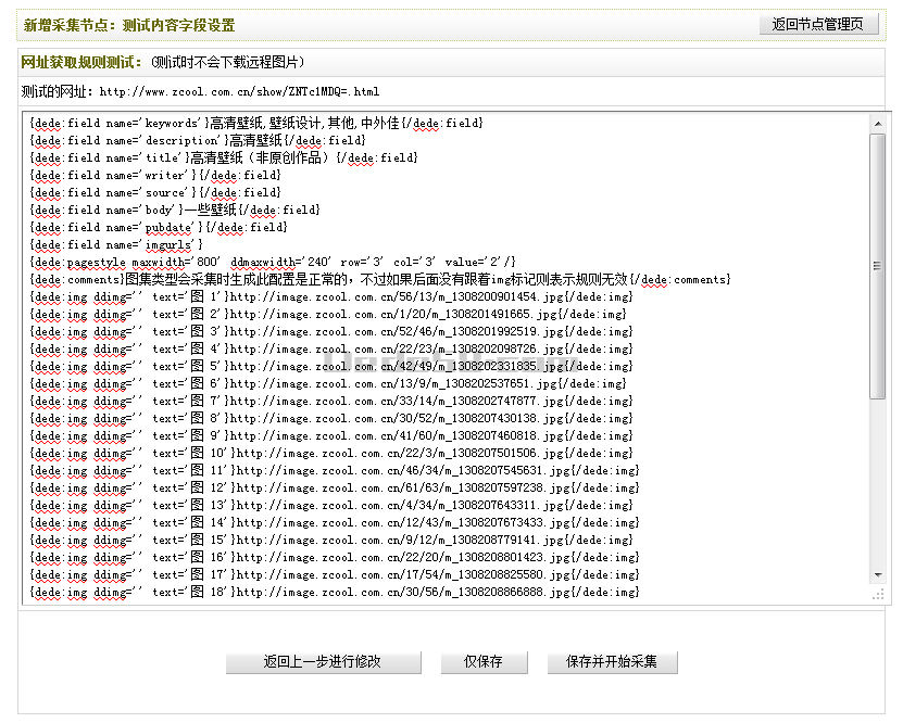 前言:本文是“Dedecms采集功能的使用方法 --- 圖片集“的第二節(jié),在前一節(jié)的基礎(chǔ)上,將會對新增采集節(jié)點(diǎn)中的第二步:“設(shè)置字段獲取規(guī)則”部分做一個簡單的介紹。為了與前文保持一致,本文將延續(xù)使用前文的章節(jié)標(biāo)記。
