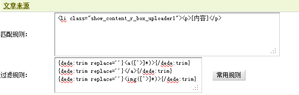 從圖28中,可發(fā)現(xiàn)上傳者的名字介于“<li class="show_content_r_box_uploader1"><p>“和“</p>”之間,因此這里應(yīng)填寫“<li class="show_content_r_box_uploader1"><p>[內(nèi)容]</p>”作為文章來源的采集規(guī)則。雖然,選定的采集規(guī)則能采集到上傳者的名字,但是同時也包含了所不希望采集到的圖片和鏈接,下面通過設(shè)置過濾規(guī)則把它們過濾掉。首先,過濾掉鏈接,這里使用“{dede:trim replace=''}<a([^>]*)>{/dede:trim}{dede:trim replace=’’}</a>{/dede:trim}”;其次,使用“{dede:trim replace=''}<img([^>]*)>{/dede:trim}”過濾掉圖片。填寫后,如圖29所示,