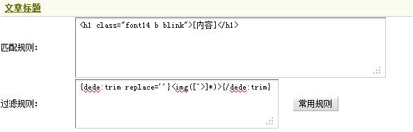 這里的文章標(biāo)題處在”<h1 class=“font14 b blink”></h1>”之間,因此這里應(yīng)該填寫”<h1 class=“ font14 b blink”>[內(nèi)容]</h1>”作為文章標(biāo)題的匹配規(guī)則。對于所包含的<img src=”/images/digest1.gif alt=”推薦的欣賞”>”可根據(jù)需要選擇保留或者是過濾掉。如果希望把這張圖片過濾掉,需要在過濾規(guī)則中填寫:“{dede:trim replace=''}<img([^>]*)>{/dede:trim}”。填寫后,如(圖26)所示,
